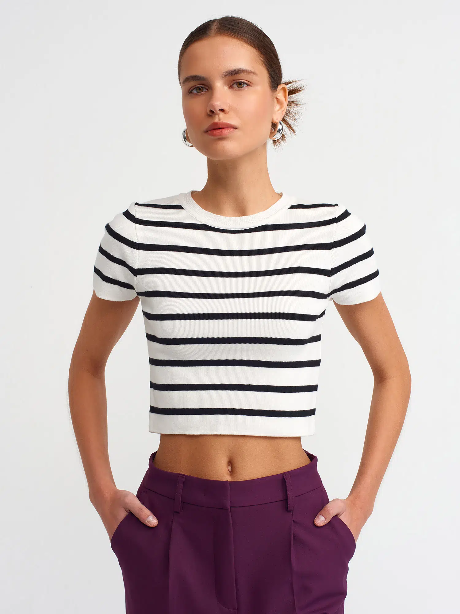 Etiketler10538 DİLVİN CROP KAZAK BİSİKLET YAKA ÇİZGİLİ KISA KOL