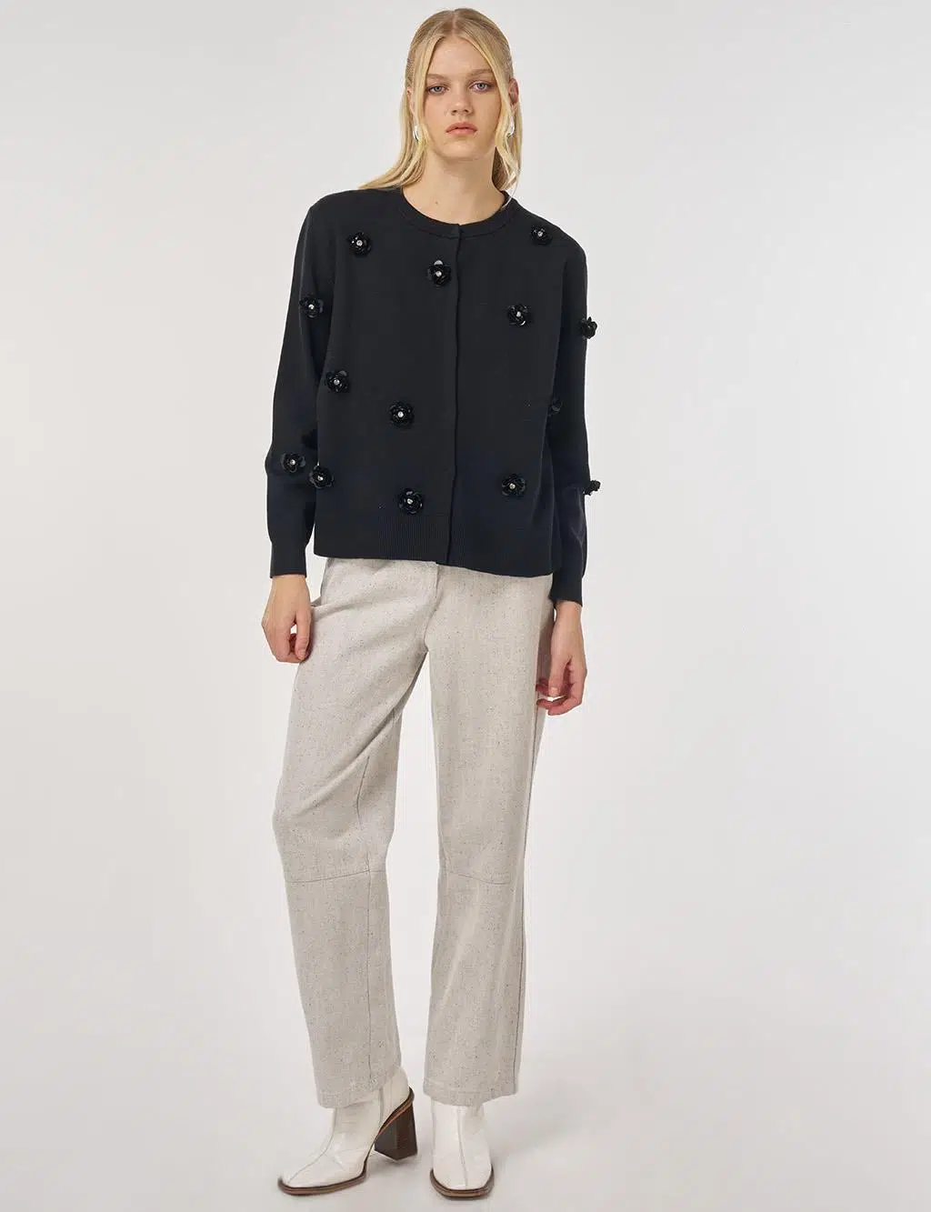 Kayra Çiçek Nakışlı Triko Hırka, viskoz kumaş karışımından üretilmiştir. Çiçek nakışları ile hareket kazanan triko hırkayı mevsim geçişlerinde tercih edebilirsiniz. Etek, basic gömlek ya da aksesuarlar ile şık bir görünüm elde edebilirsiniz.